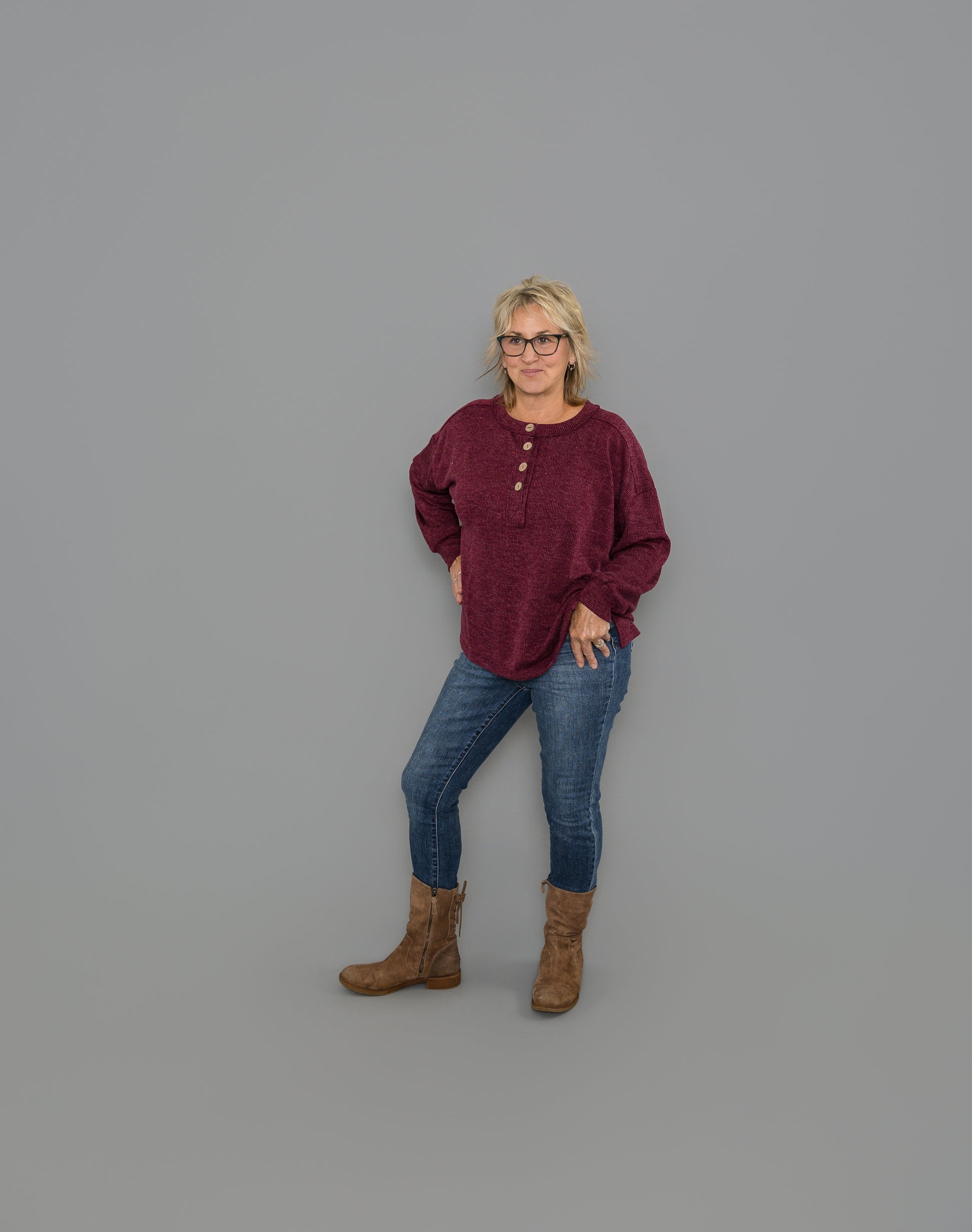 Garment Details: Functional Buttons, knit top, ribbed, round neck, half button.